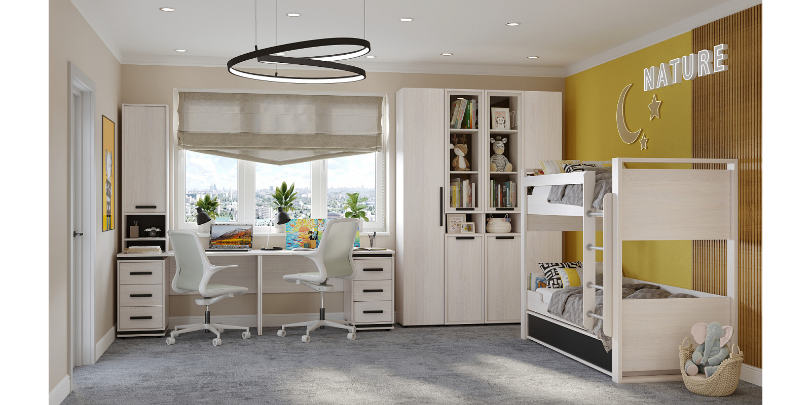 Высокий шкаф для хранения идеально подходит для комнаты подростков, в которой слишком много разнообразных и таких "нужных вещей". Верхний рамочный фасад с тонированным стеклом открывается за раму, нижний фасад Контур открывается за серую ручку из массива. Верхний и нижний фасады можно перенавесить на левую и на правую стороны.