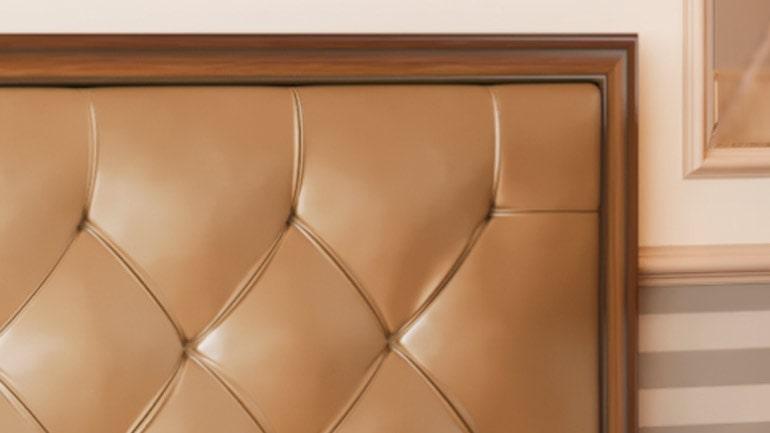 Изголовье кровати обшито тканью Велюр. Изготавливается в двух цветовых решениях: - Вудлайн кремовый/ Сандал белый - Дуб Кальяри/ Дуб Коньяк
