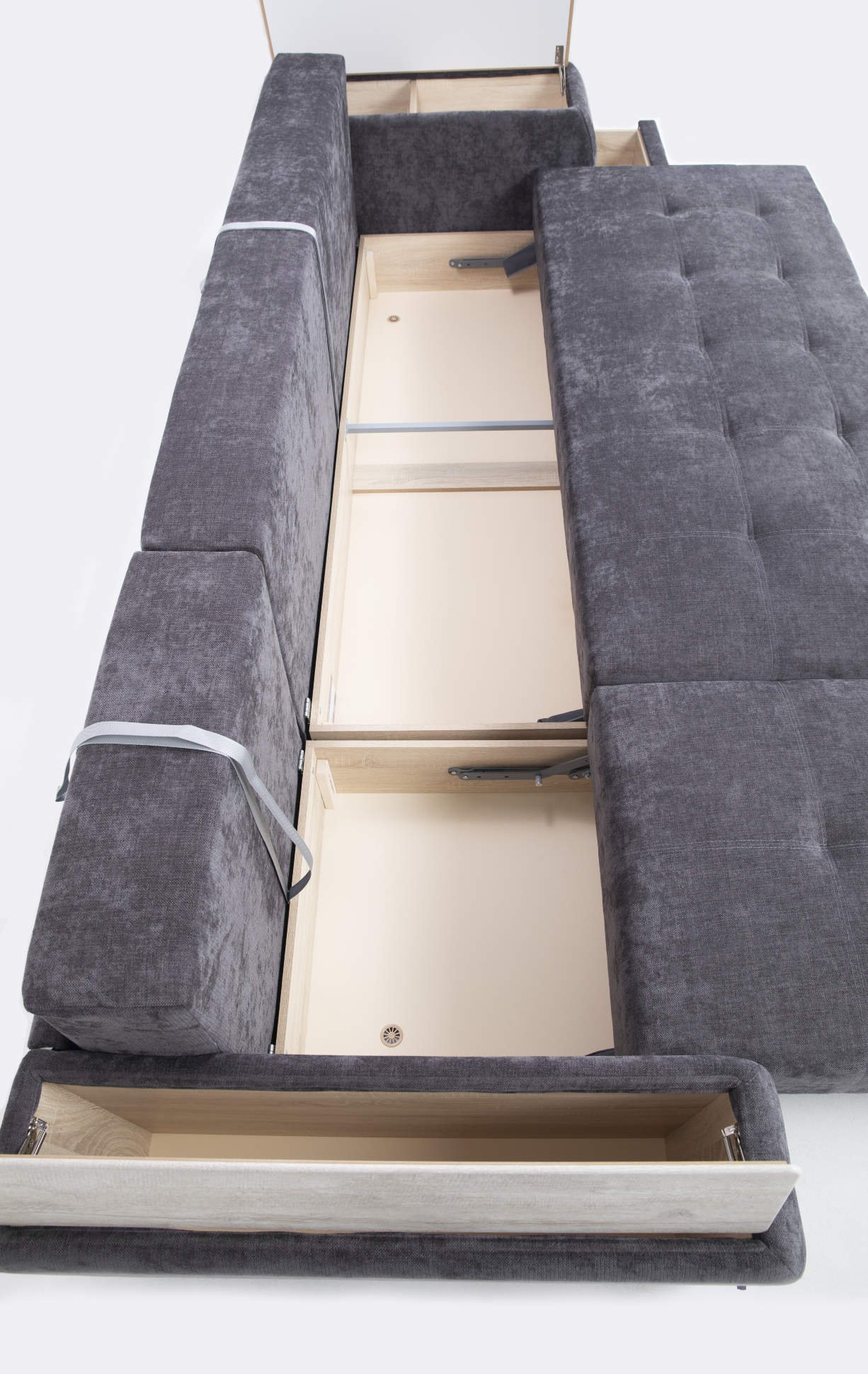 Благодаря выдвижному шезлонгу диван способен легко трансформироваться из прямого в угловой.