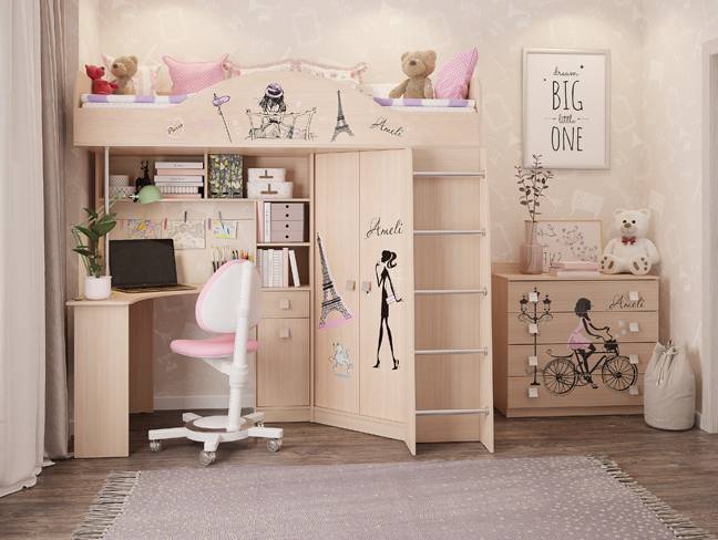 Вы думаете, как разместить мебель в комнате ребенка? Комплекс детский «Амели» настоящий спаситель 4 в 1: в нем сочетается шкаф для одежды, рабочий стол, полки для книг и место для сна ребенка.
