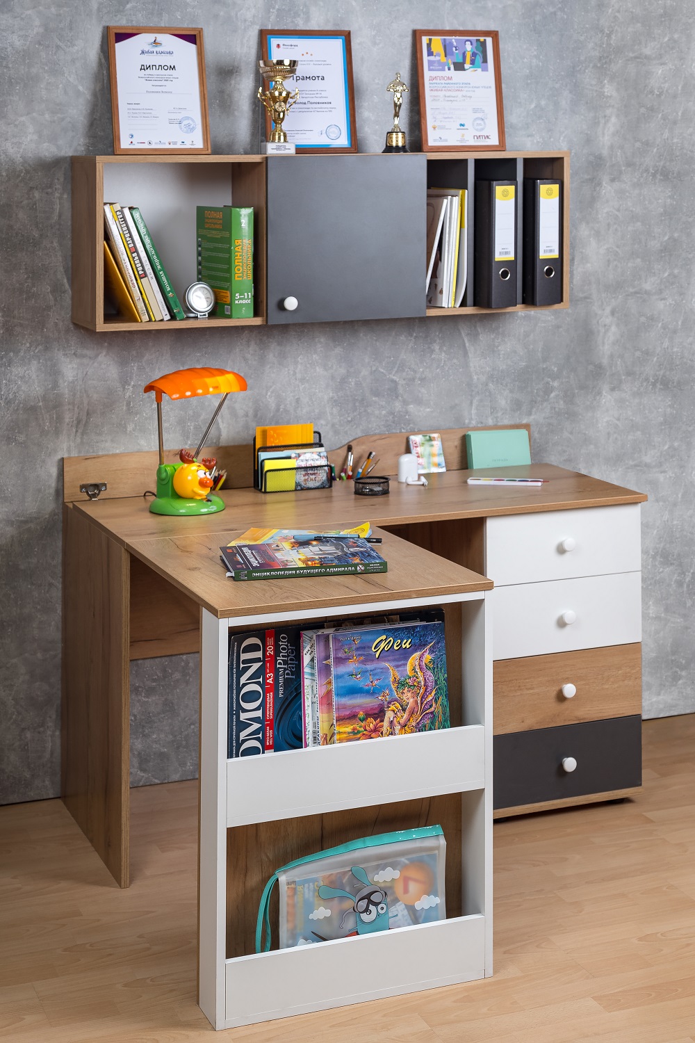 Навесной шкаф с открытыми и закрытыми нишами и полками - отличный вариант настенного хранения различных вещей. Отличие модуля состоит в том, что его можно подвесить как вертикально, так и горизонтально. В вертикальном положении навесной шкаф прекрасно сочетается с письменным столом.