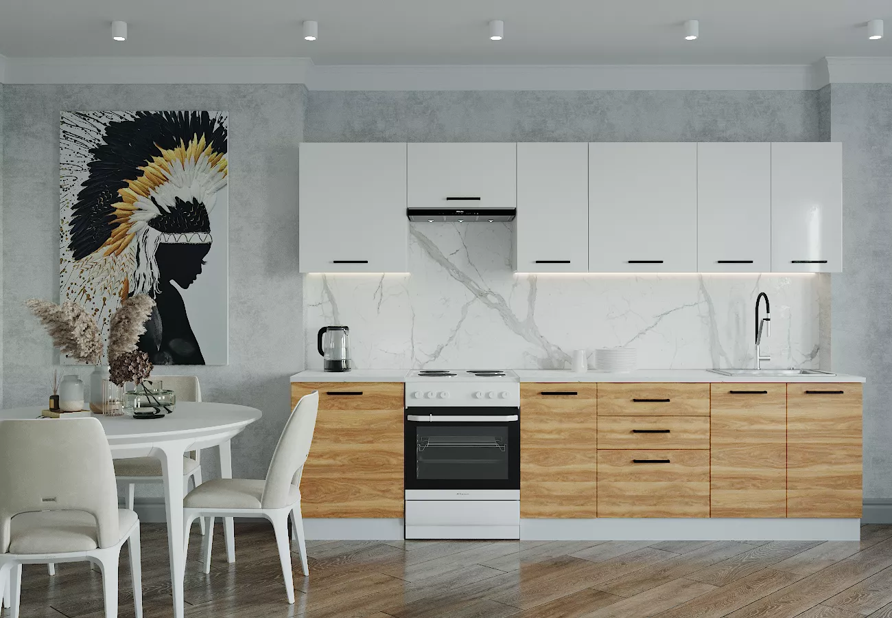 Фасады верхних модулей со свесом 12 мм дают возможность использовать без установки ручек.