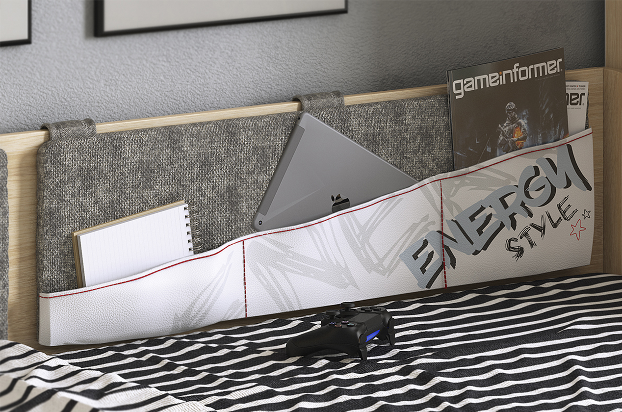 Эта кровать станет ярким элементом интерьера в комнате вашего ребенка. Просторный ящик для хранения белья также может служить дополнительным спальным местом. Мягкие накладки на спинке добавляют уют и комфорт.