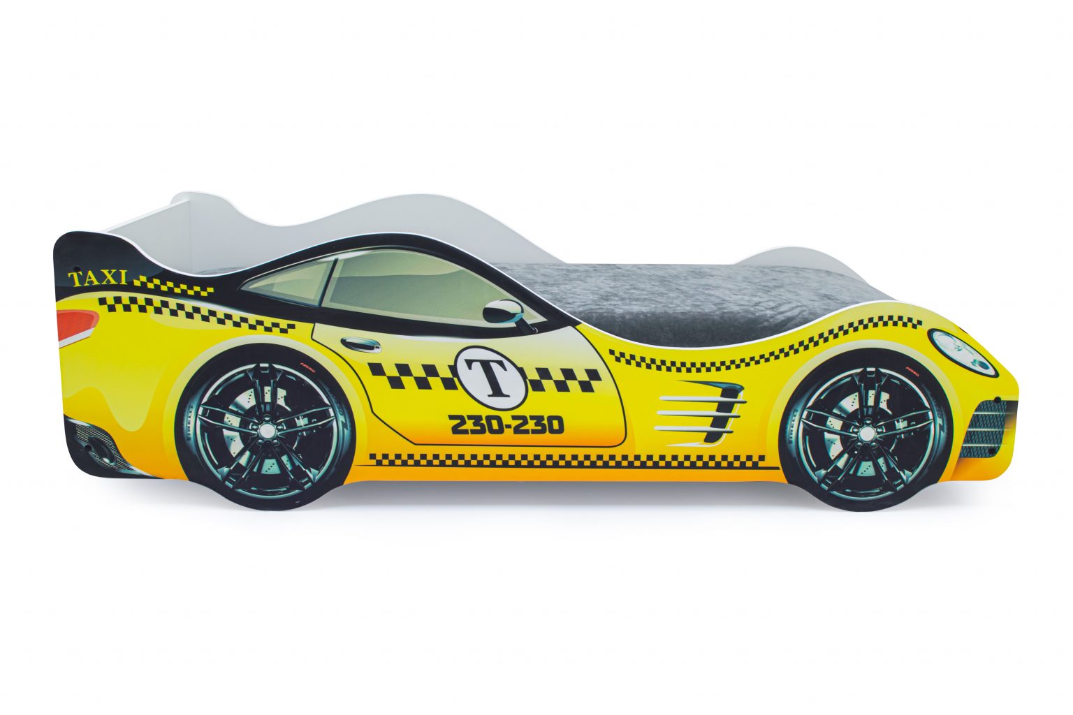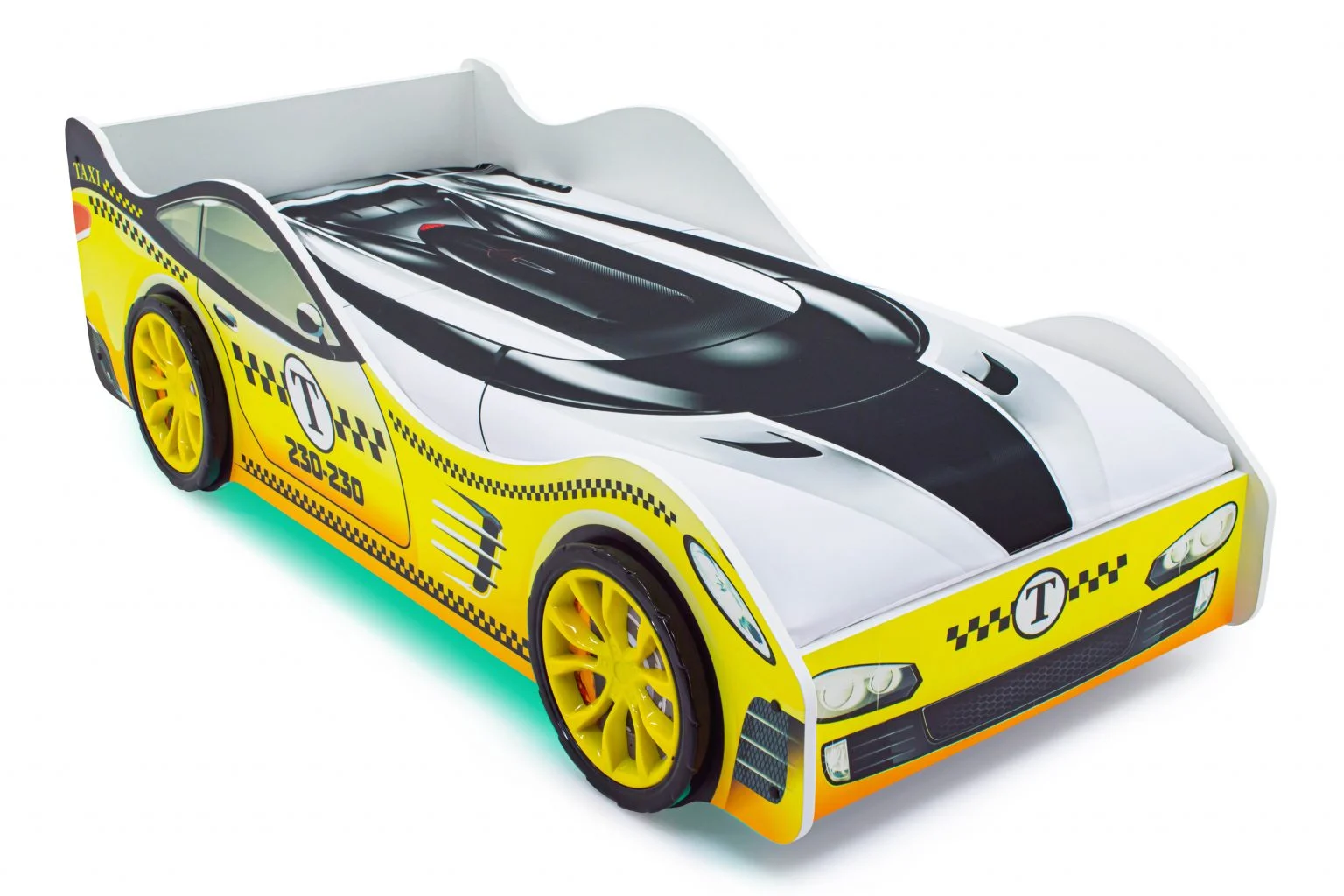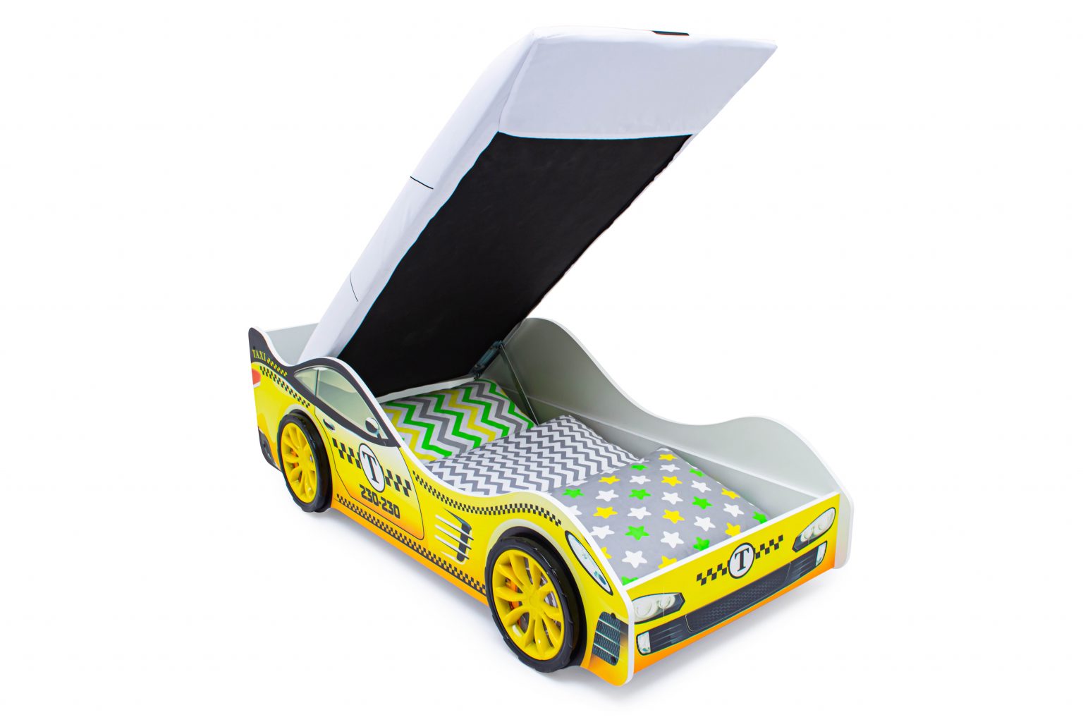 Детская кровать-машина “Такси” с подъемным механизмом станет любимым местом для сна и игр мальчика или девочки от 2 до 10-12 лет.