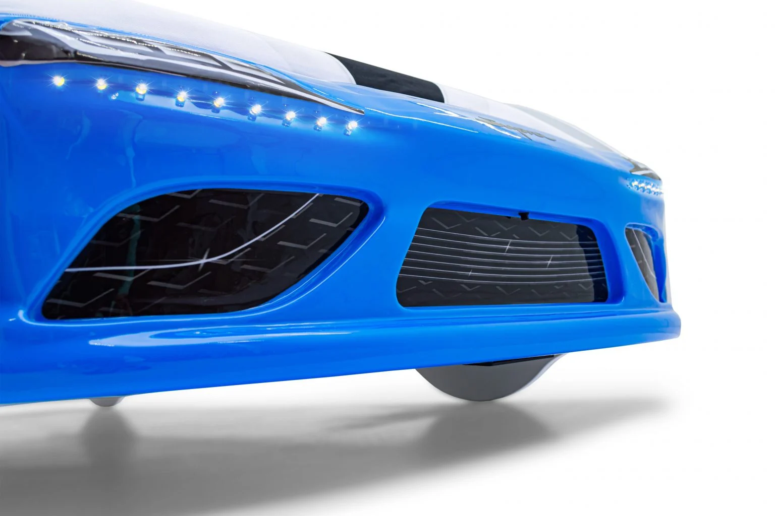 Подсветка фар состоит из 18 светодиодов, встроенных в бампер. Работают от двух батареек АА. Включаются и выключаются с помощью кнопки на бампере.