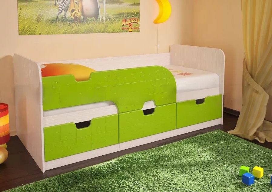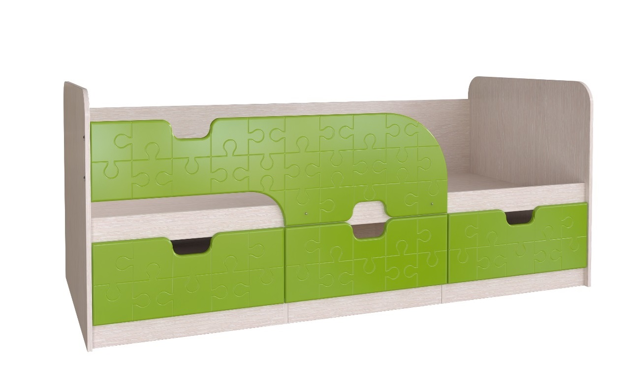Детская кровать "Минима" идеально подходит как для отдельной комнаты, так и для небольшой квартиры. Кровать на плоском основании оборудована предохранителями от падения в виде фигурных деталей МДФ. Под спальным местом расположены три вместительных выдвижных ящика, в которых легко поместятся не только постельные принадлежности, но и масса детских игрушек.