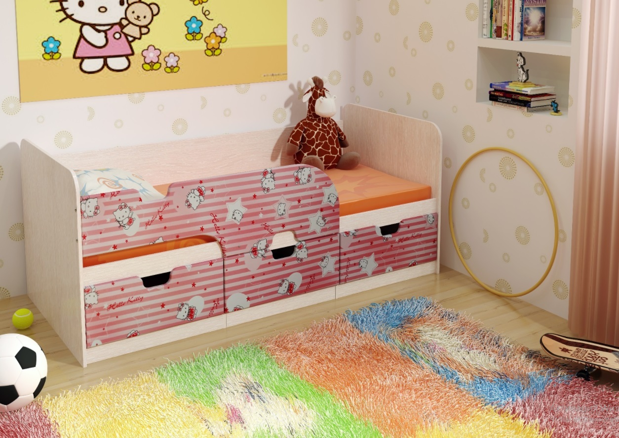 Детская кровать "Pink" выполнена в яркой цветовой гамме. Фасады украшены изображением мультперсонажа, знакомого каждой девочке, из аниме-сериала "Hello, Kitty". Корпус изготовлен в светлых тонах декора "Дуб Атланта".