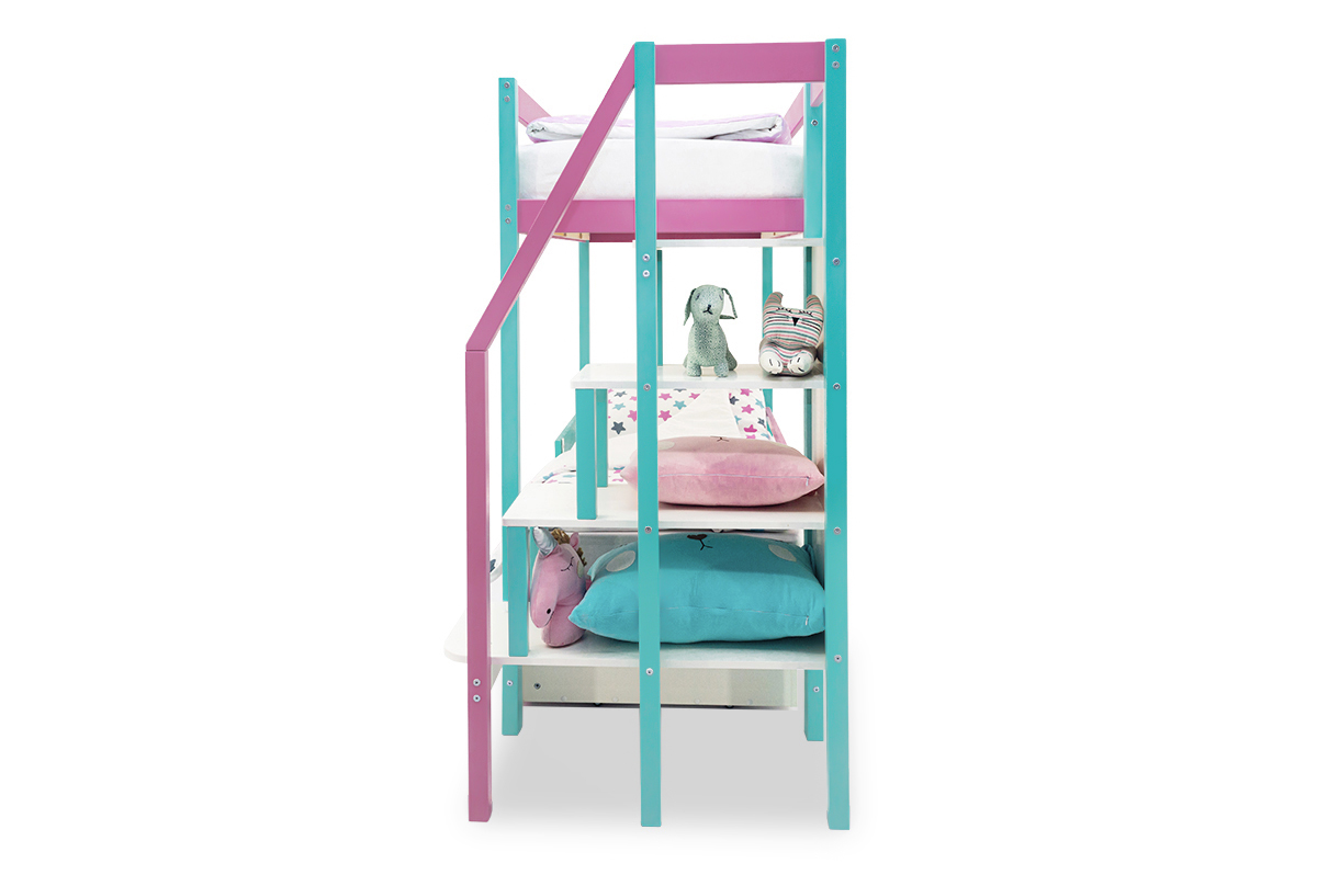 Кровать оборудована практичной лестницей-стеллажом. Полки лестницы можно использовать для игрушек, книг, ночника. Лестницу легко зафиксировать как справа, так и слева от кровати, что очень удобно. На каждом ярусе установлено прочное ортопедическое основание из 12 лат. Спальное место выдерживает нагрузку до 200 кг.