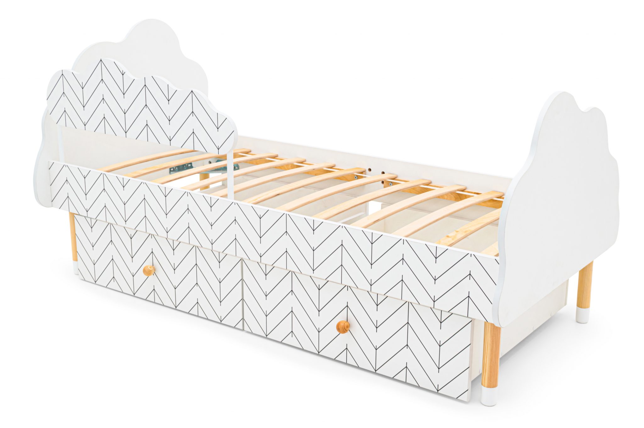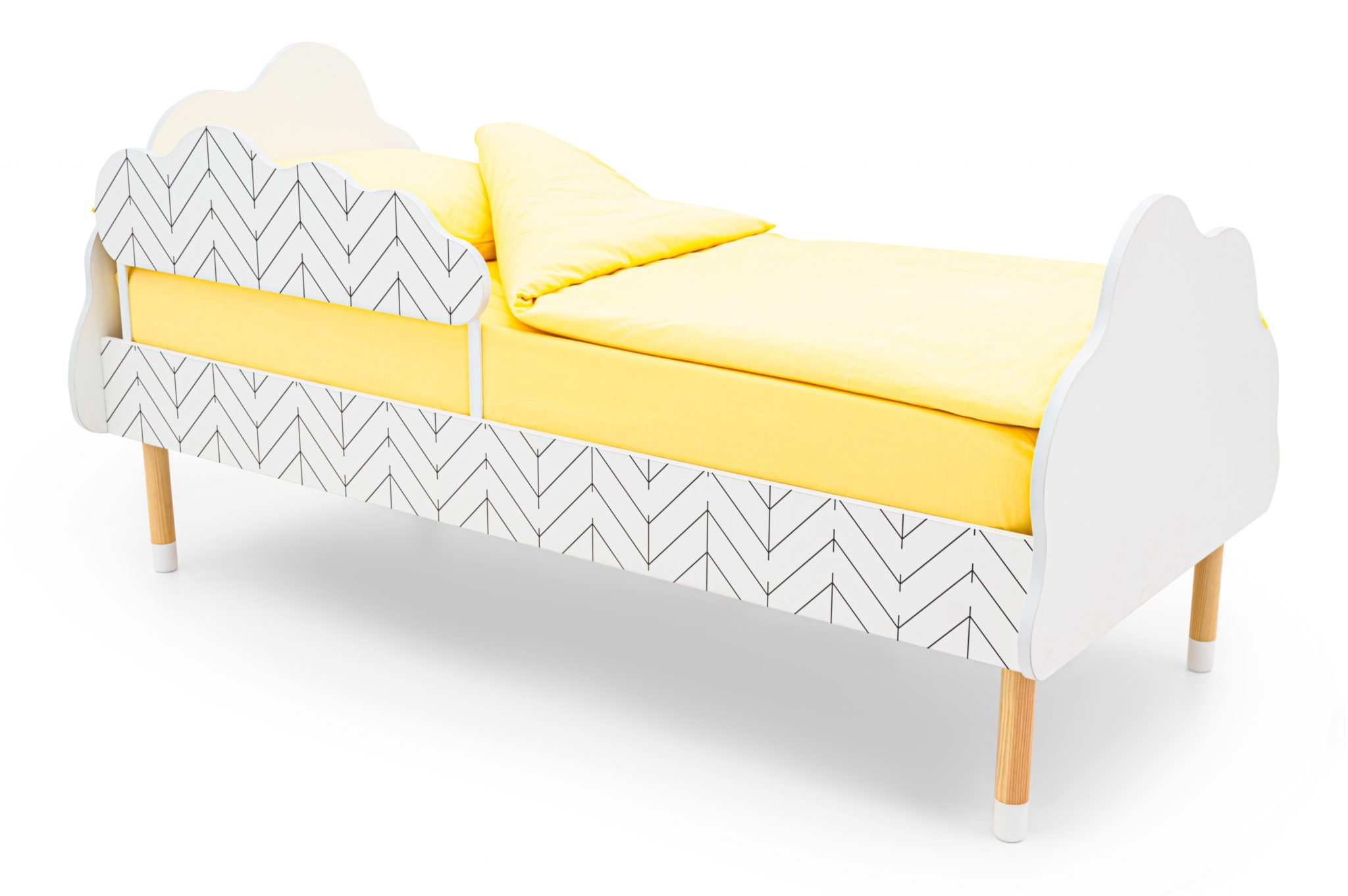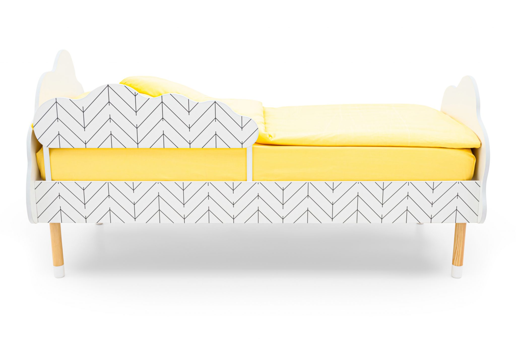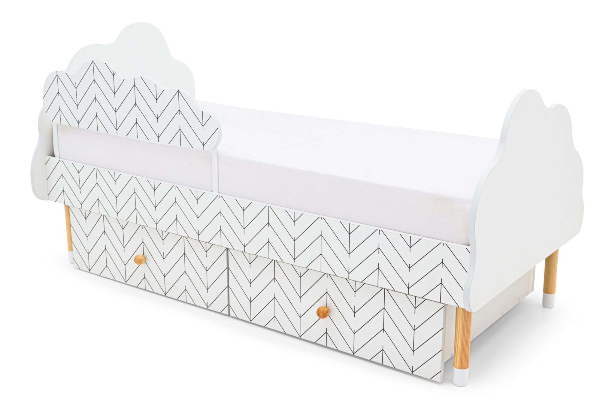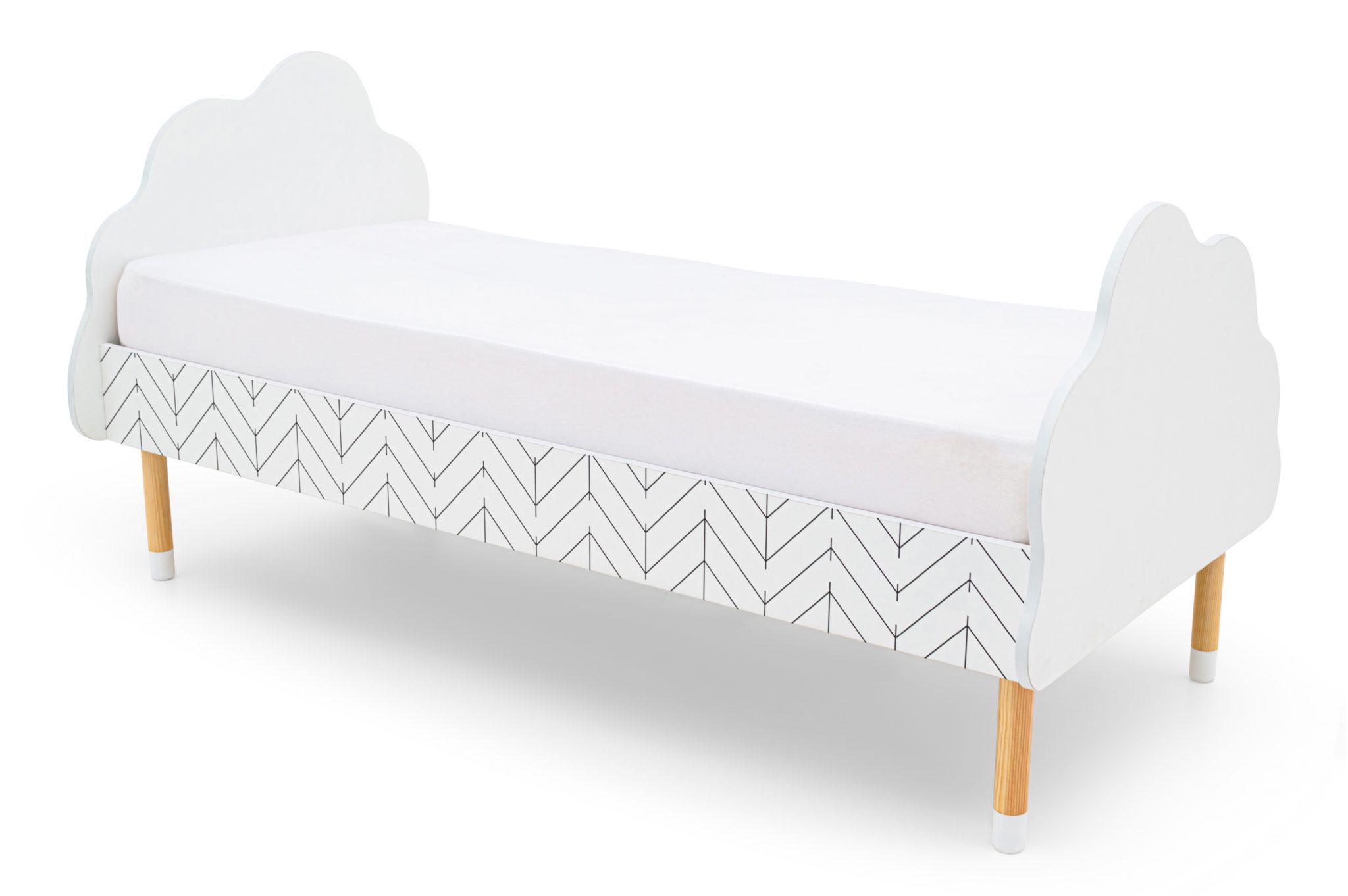 Изголовье и изножье кроватки сделаны в виде облака. Высота от пола до самого высокого места составляет 66 см. Это позволяет даже маленькому ребенку комфортно забираться и спускаться с нее, не рискуя упасть. Специальная конструкция кровати позволяет с лёгкостью присесть или прилечь рядом взрослому, если ребенок не может заснуть.
