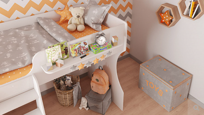 Продуманный дизайн позволяет организовать комфортное место для сна и оптимально использовать высоту помещения. Наличие полочки дает возможность дополнить спальный уголок любыми аксессуарами и игрушками. Ребенок самостоятельно может украшать и заполнять полочку у спального места рамками для фотографий, игрушками и всеми необходимыми вещами.