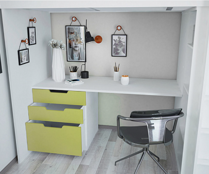 Стол, тумба и шкаф располагаются под кроватью для экономии пространства в комнате.