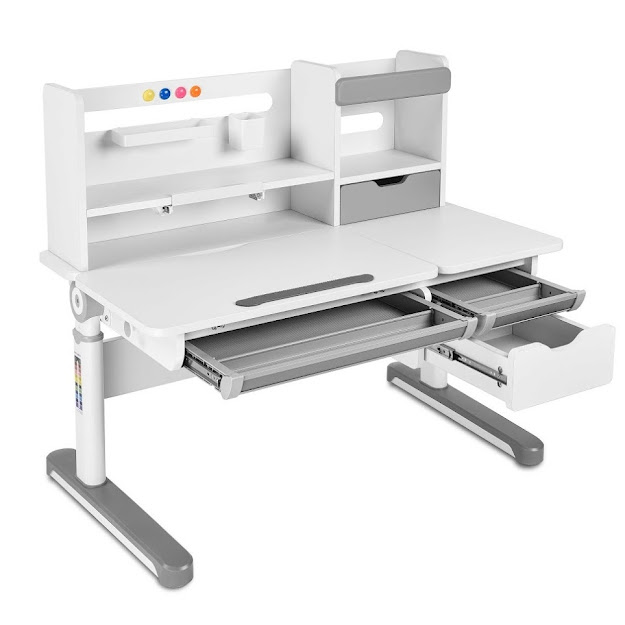 Детский стол-трансформер FunDesk Sentire является удлиненной на десять сантиметров версией парты Pensare.Также как и младшая версия имеет вместительную надстройку с тремя полками, выдвижным ящиком, подставкой для книг, и перфорацией для крепления дополнительных аксессуаров.Под разделенной на две зоны столешницы, располагаются еще три выдвижных ящика, два из которых имеют разделение внутреннего пространства на секции, для более комфортного хранения вещей.Для безопасности ребенка все углы парты закруглены, а на механизме регулировки высоты и ножках присутствуют пластиковые накладки, что помимо защиты, также выполняют декоративную роль.Простая регулировка по высоте с помощью съемного рычага можно быстро и просто отрегулировать парту по высоте.Также в комплекте поставки присутствует специальная наклейка от производителя с подробной таблицей соотношения роста ребенка, и подходящей для него высоты столешницы.