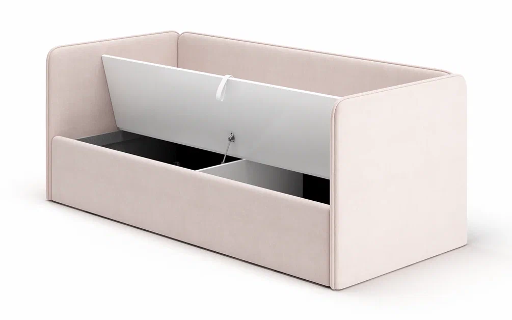Вместительный ящик-книжка позволит хранить не только постельное бельё, но и игрушки. Дно ящика выполнено из ЛХДФ, борта - ДСП, обшитые файбертексом, разделитель – ЛДСП.