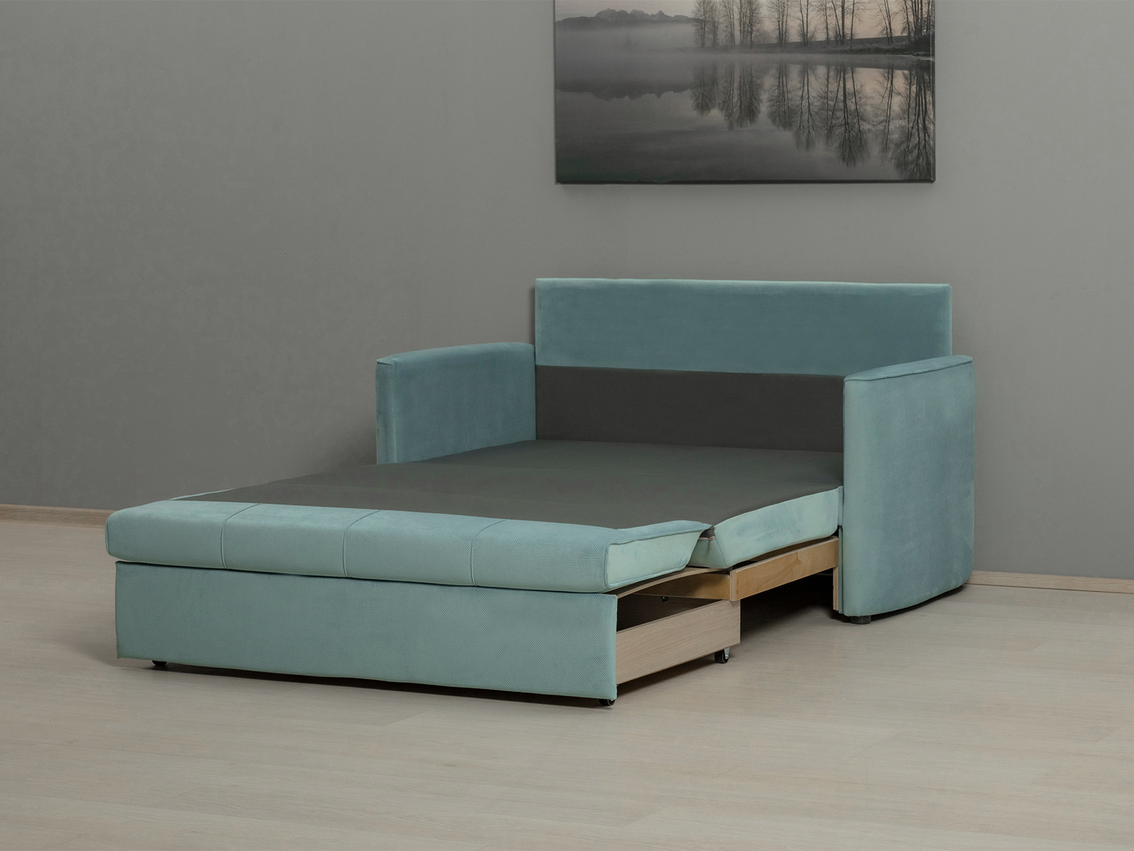 Диван-кровать Мелани Р (120) - компактный современный диванчик. Скругленные подлокотники с кантами подчеркивают эргономичность модели. Простой и надежный механизм трансформации на каждый день обеспечит удобным спальным местом ребенка или подростка. Может использоваться в качестве гостевого спального места для взрослого. Размер сп. места 195 х 120 см, есть небольшой бельевой ящик. Диван выполнен в мягком фактурном велюре. "Пальчиковый эффект" на ткани обивки выражен средне. Опоры - цвет черный, круглые, высота 25 мм., выполнены из высококачественного пластика. Прочность конструкции ножек обеспечена ребрами жесткости и внутренним креплением под фурнитуру.