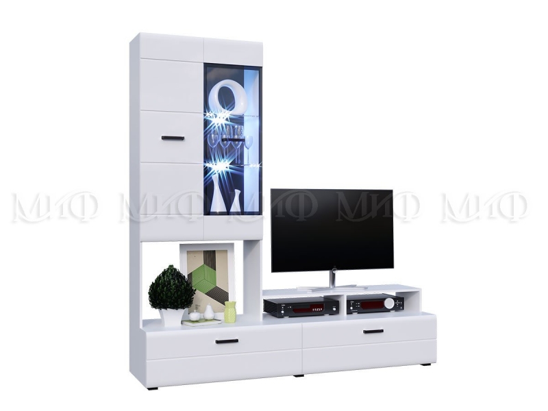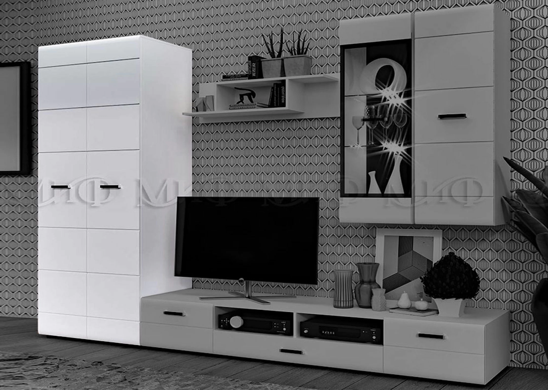 Изысканная, белоснежная, с приятным блеском гостиная несомненно украсит собой любую квартиру или дом. В гостиной есть все необходимые элементы для красивого оформления комнаты. Фасады с фрезеровкой и стеклянные витрины создают современный и стильный образ вашему дому.