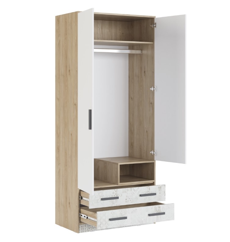 Односторонняя сборка. Ручки накладные, выполнены из массива дерева, окрашенного эмалью графитового цвета. Шкаф имеет два распашных фасада, два выдвижных ящика на шариковых направляющих полного выдвижения и открытую нишу. Для крепления фасадов используются европейские четырехшарнирные петли фирмы Titus (Словения), в качестве доводчика установлен силиконовый демпфер-отбойник. Комплектуется штангой. Задние стенки ЛДВП накладные. Дно ящиков выполнено из ЛДВП. Рекомендуется крепление шкафа к стене.
