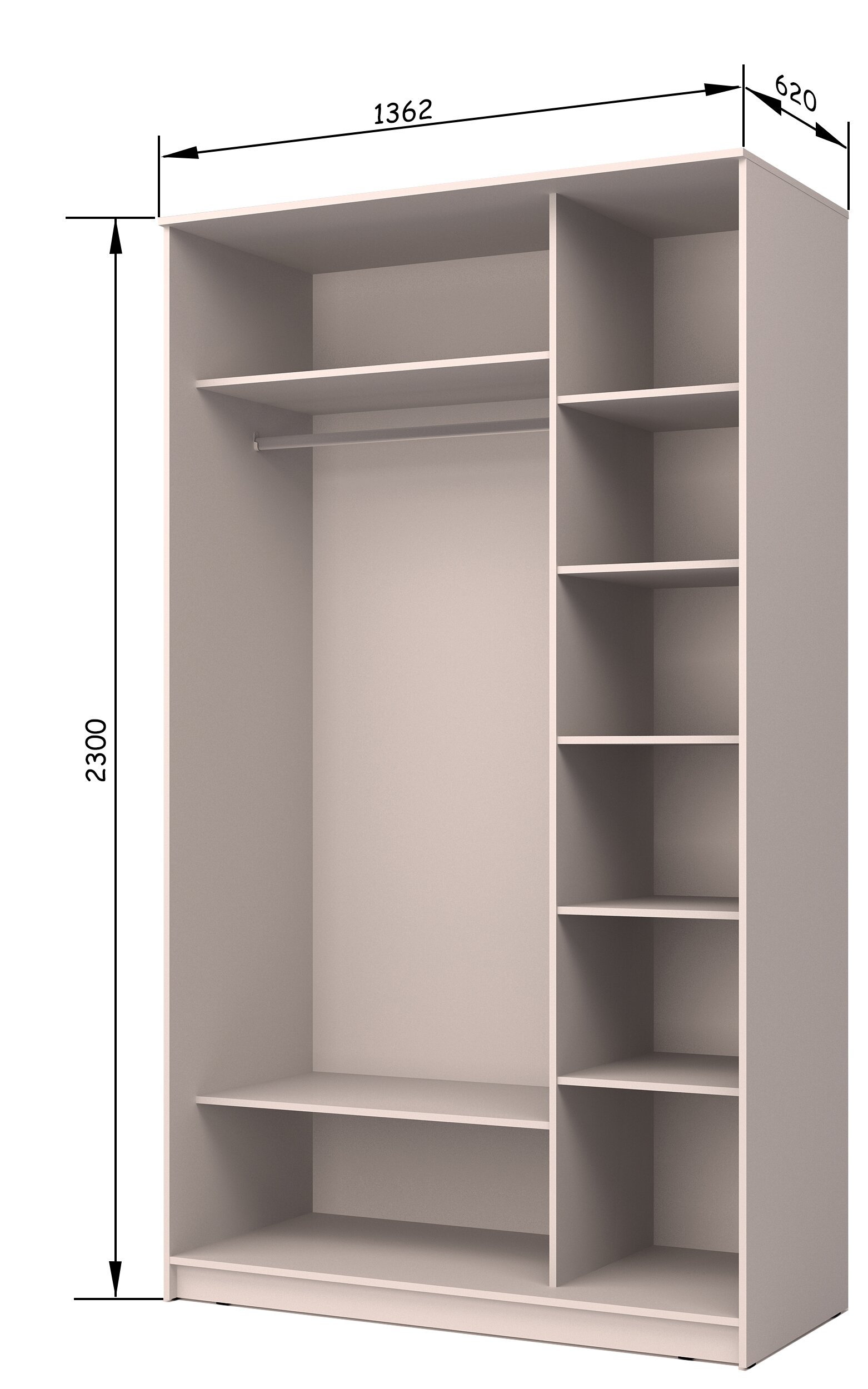 Шкаф оснащен двумя дверями-купе с наполнением из зеркала серебро с пескоструйной обработкой.