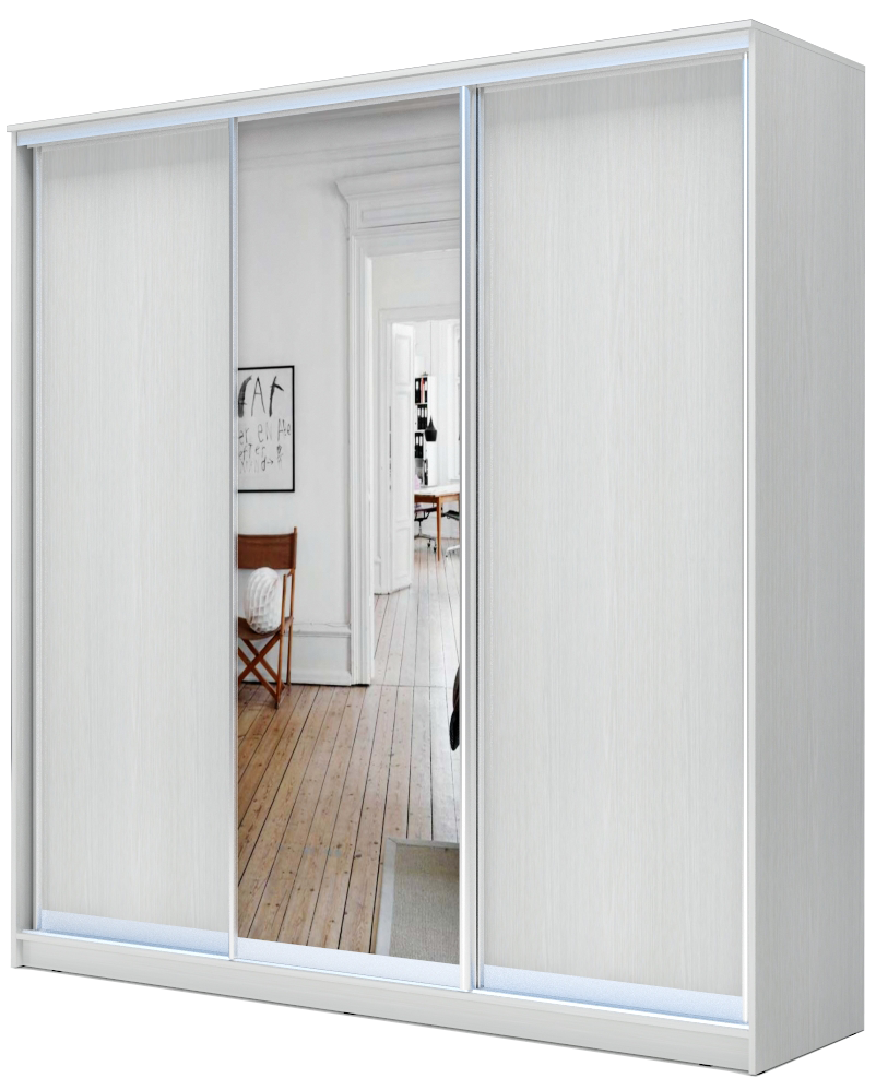 Шкаф оснащен двумя дверями-купе с наполнением из ДСП 10 мм и одной дверью-купе с наполнением зеркало серебро.