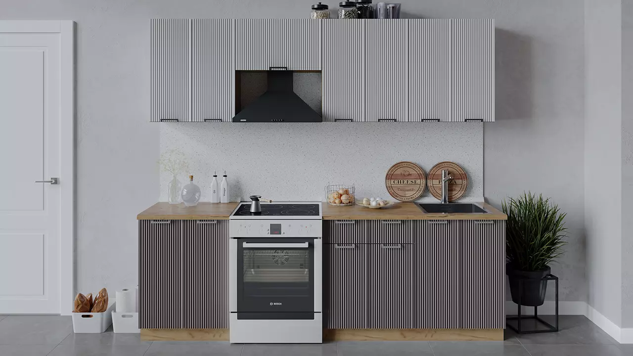 Габаритный размер готового набора модулей с учетом газовой плиты на 60 см: 240 см.