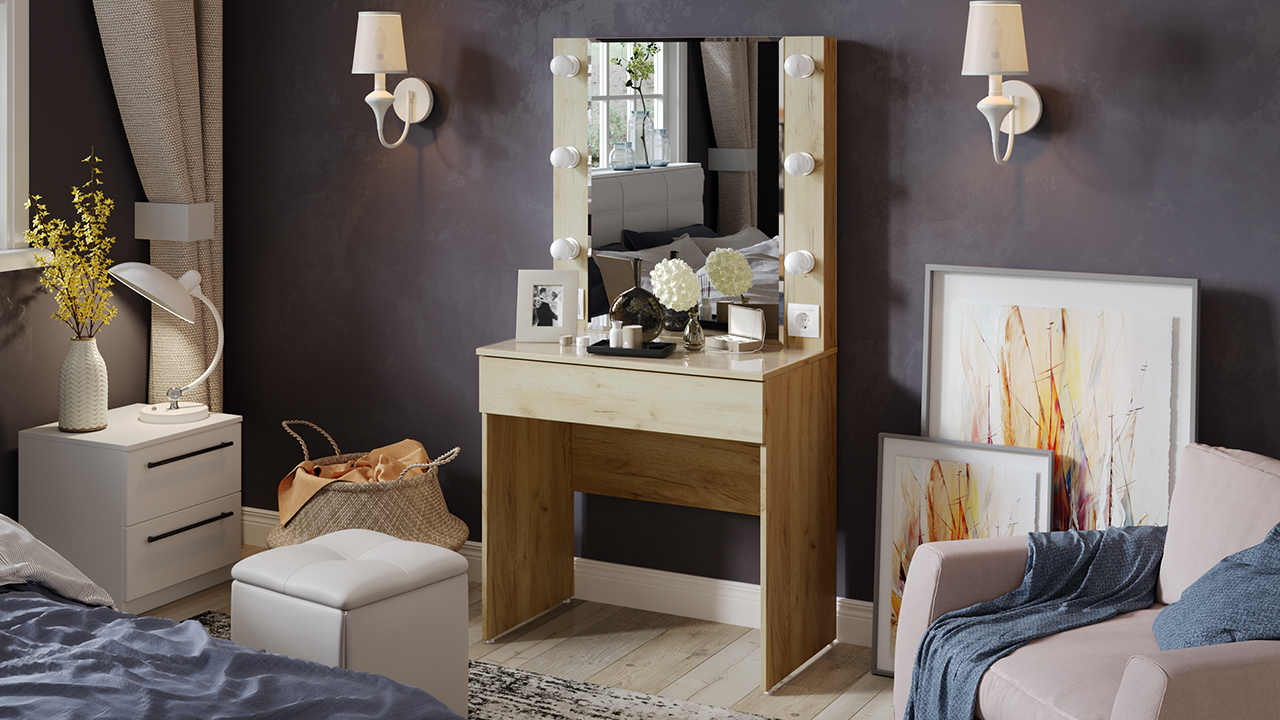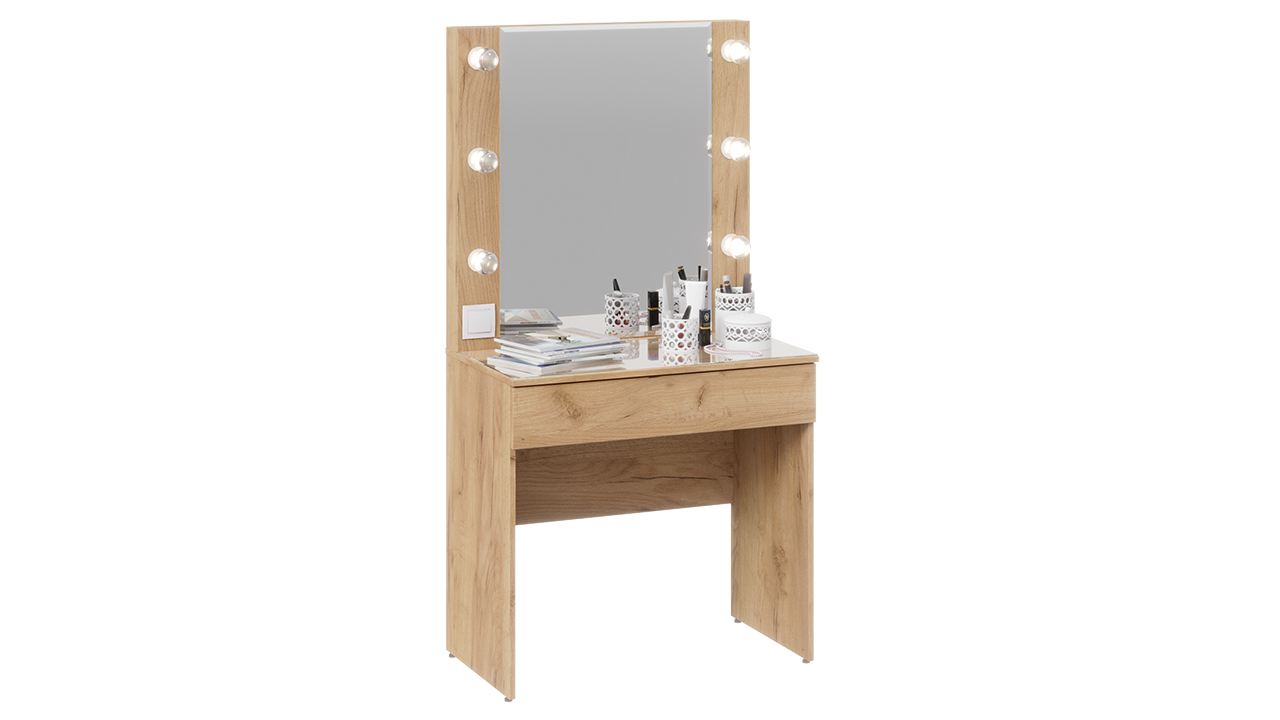 Помимо внешней привлекательности, стол достаточно вместителен. Конструкцией предусмотрена просторная столешница со стеклом и практичный ящик под ней, где можно разместить все необходимые аксессуары и косметику. Стол имеет достаточно большое зеркало, а наличие подсветки обеспечит комфортный уход за собой, которая дает ровный и мягкий свет.