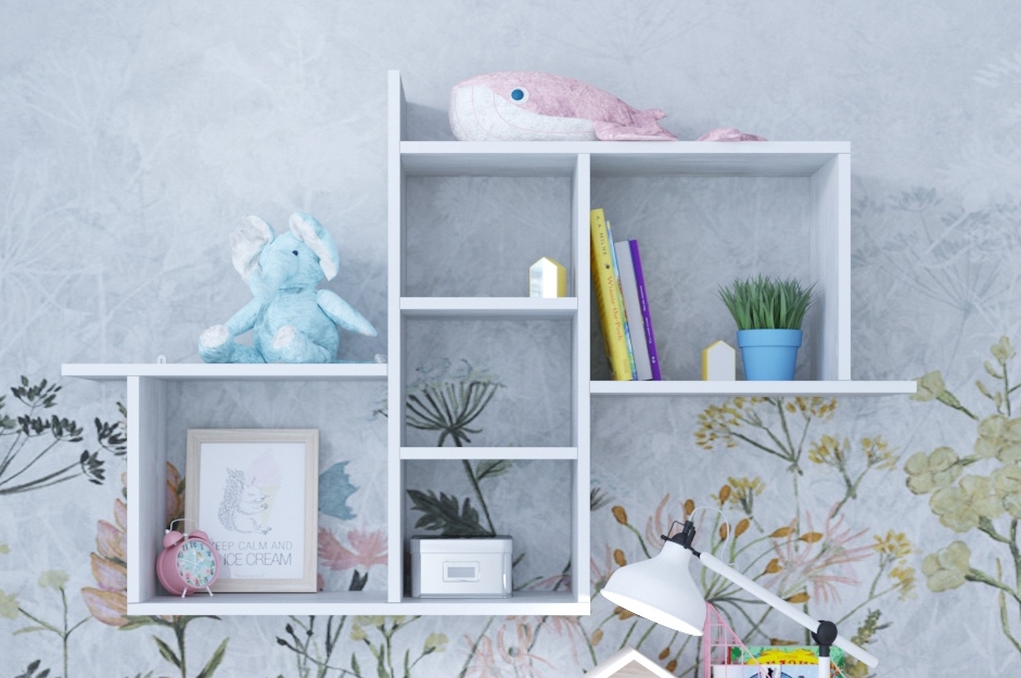 Функциональность и уют совмещаются в этой модели для детской комнаты. Открытая полка играет две основные роли — декоративную и практическую. С ее помощью можно: