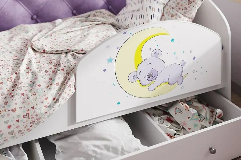 Кровать «Звездочка» станет идеальным вариантом в детскую девочки. Наличие выдвижного ящика, создает дополнительное место для хранения постельного белья, игрушек или вещей. Мебельные щиты в основании кровати, которые идут в комплекте, придают дополнительную прочность конструкции. Спинка кровати обтянутая мягкой тканью, превосходно гармонирует с фотопечатью на фасаде ящиков.