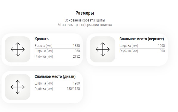 Под верхним ярусом располагается диванный блок с раскладывающимся диваном-кроватью, с механизмом трансформации «Книжка» внутри которого расположен бельевой короб. В основании под матрас предусмотрен мебельный щит, что обеспечит надежность и дополнительную прочность.
