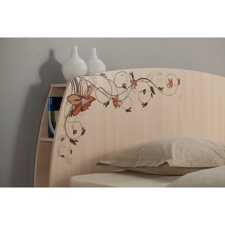 Кровать выполнена в цвете дуб Сонома и имеет ортопедическое основание, что способствует здоровому сну. Книжки, телефон и другие мелочи легко поместятся на полках за спинкой кровати и заменят вам прикроватные тумбы. Спинка кровати украшена современным принтерным  рисунком.