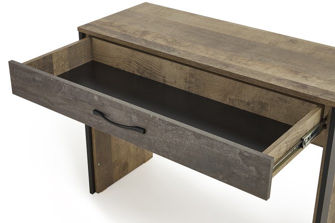 Туалетный стол из коллекции мебели для спальни Hugo оценят поклонники лофта и индустриального стиля. Дизайнеры использовали эффектное сочетание оттенков и текстур, черные рамки боковин подчеркивают геометричность стиля изделия. Столик оборудован глубоким выдвижным ящиком,в котором поместятся и косметика, и туалетные принадлежности, и уходовые средства. Крышка выдерживает вес 20 кг, поэтому вы можете расположить на ней всё, что пожелаете. За матовым покрытием легко ухаживать, главное — выполнять рекомендации производителя и оберегать поверхность от воды.