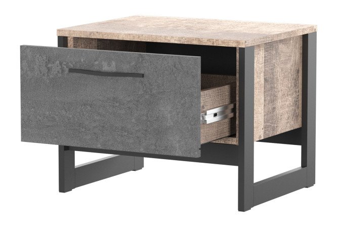 Прикроватная тумба Hugo — эффектная модель из одноименной коллекции мебели. Это отличный вариант для лофта или спальни, гостиной, прихожей в индустриальном стиле. Ножки в виде рам, фасад в декоре под камень оттенка, идеально сочетающегося с древесным декором корпуса, придают модели современный, несколько брутальный облик. Вместительный ящик полного выдвижения позволит хранить всё, что должно быть под рукой в прикроватной зоне. Прочная крышка может выдержать вес до 15 кг, поэтому вы сможете поставить на нее даже тяжелый светильник или большую вазу с цветами.