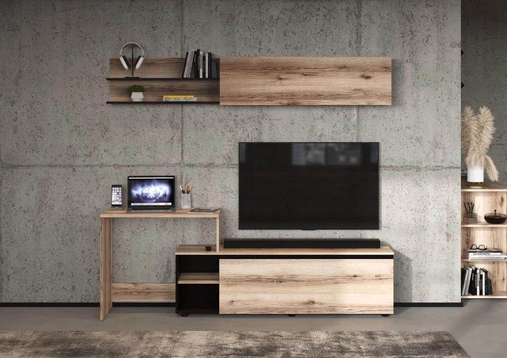 Сплошные чистые линии цвета Венге по фасадной группе благородного древесного декора создают современный универсальный силуэт помещения. Открытое полочное пространство верхней и нижней части тумбы идеально подходит для хранения книг, декоров, предметов шаговой доступности.