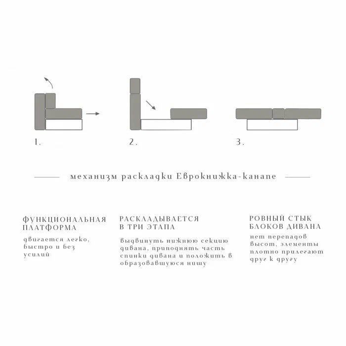 Мягкие элементы сидения и спинки сформированы из пенополиуретана. Независимые подушки, наполненные мягкими элементами пенополиуретана, придают дополнительную мягкость спинке изделия. В основании сидения имеется ниша для хранения постельных принадлежностей. Спальное место формируется на основе механизма трансформации "Еврокнижка". Каркас изделия выполнен из хвойных пород древесины, древесно-плитных материалов.