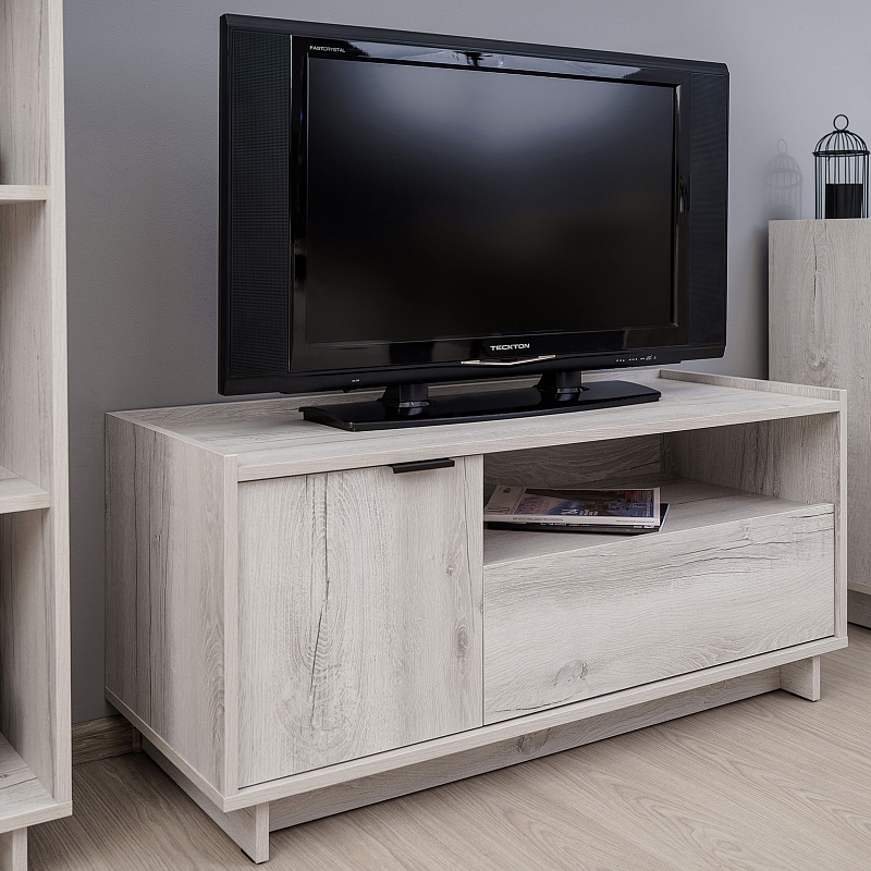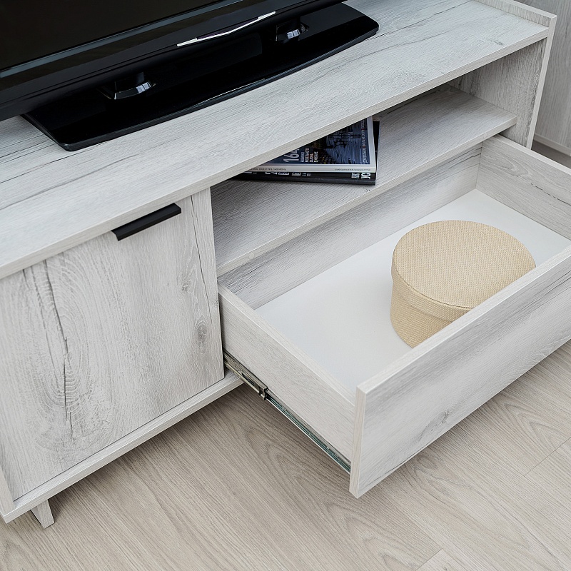 Светлая тумба Флекс 3 Тумба ТВ в современном минималистичном дизайне гармонично дополнит любую гостиную. Изюминка тумбы - бортики по трем сторонам. Выдвижной ящик на шариковых направляющих плавно и бесшумно открываются за фасад. Притопленный цоколь создает ощущение легкости и воздушности. На невысокой тумбе можно разместить телевизор диагональю до 49''.
