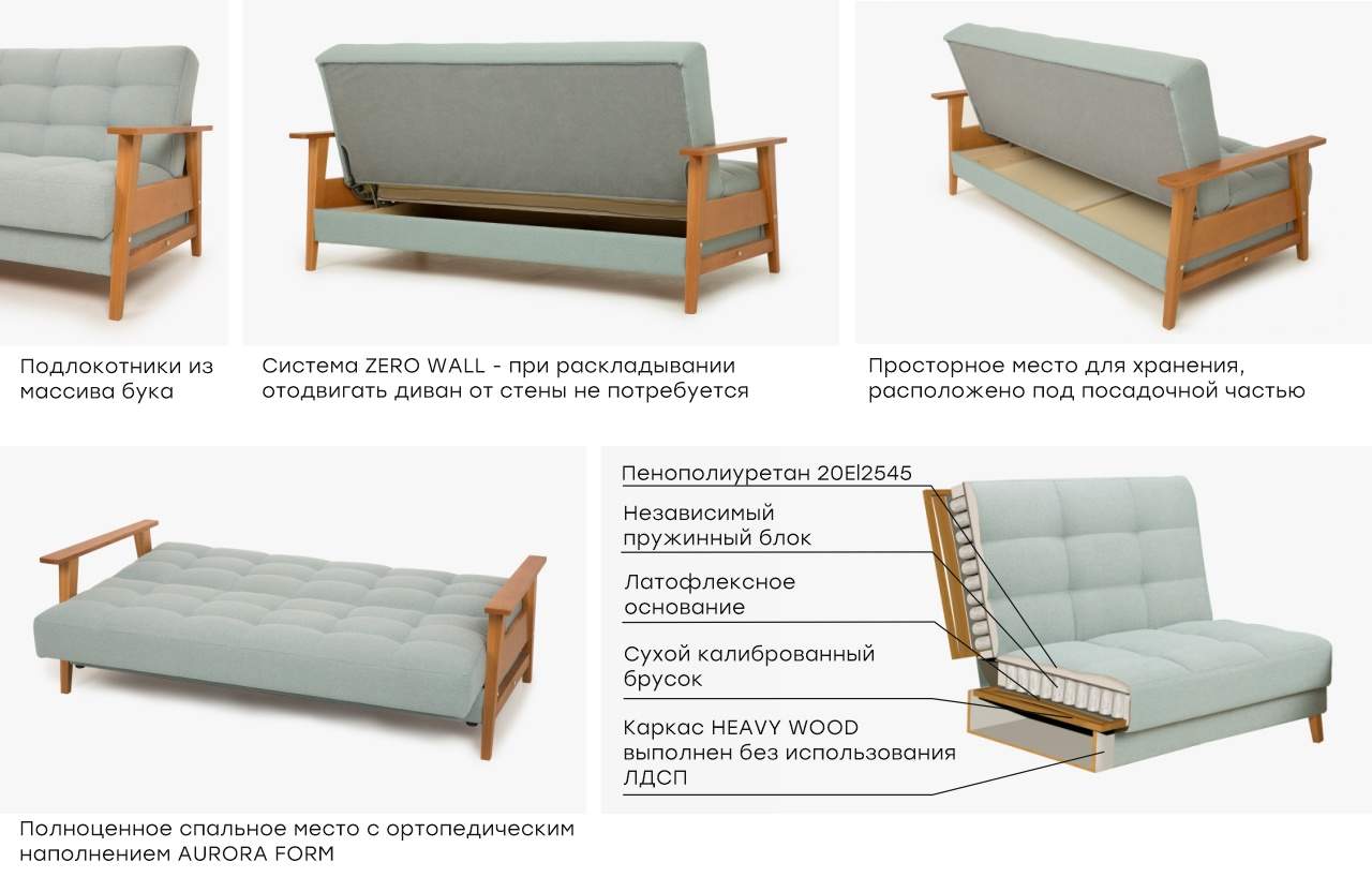 С помощью механизма «книжка» вы сможете легко и быстро разложить диван в кровать. С помощью системы ZERO WALL при раскладке отодвигать диван от стены не потребуется. С ортопедическим наполнением AURORA FORM ваш сон будет комфортным и здоровым. Надежный каркас HEAVY WOOD выполнен без использования ЛДСП. Уникальная система SOFT LINE не только придает визуальный стиль, но и обеспечивает пышность и мягкость форм, минимизируя растяжение ткани.