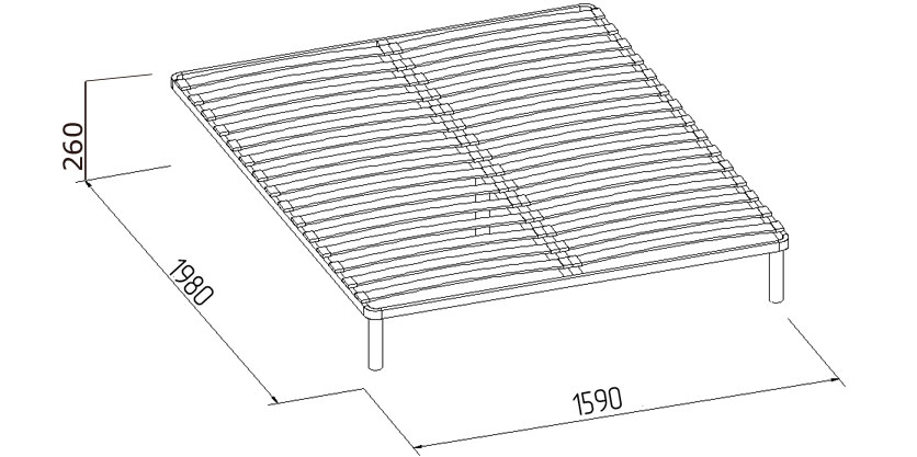 Стационарное основание с гибкими ламелями из фанеры. Металлический каркас окрашен в чёрный цвет. Такое основание экологично и выдерживает нагрузку 300 кг с учетом веса матраса. Равномерное распределение нагрузки на основание в ходе эксплуатации позволит увеличить его срок службы.