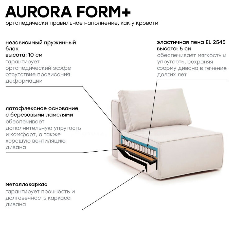 | Наполнение | AURORA FORM+ (Латофлексное основание, независимый пружинный блок 100мм, термополотно, ППУ марки 50HR 35-плотность, 35-жесткость, наполнение высотой 150мм) |