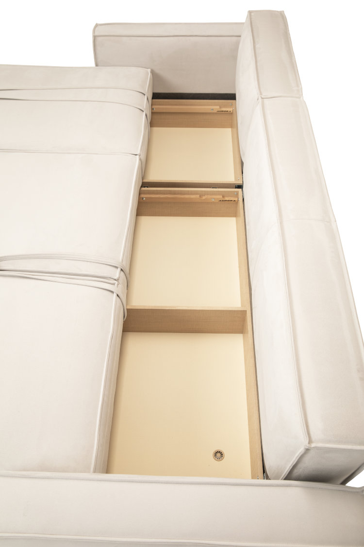 В конструкции прочный металлический каркас HEAVY METAL с повышенной гарантией 67 месяцев. Дополнительное положение RELAX позволяет телу максимально расслабиться, а наклон увеличивает глубину сиденья на 30%. Механизм «еврокнижка» превращает диван в кровать без особых усилий. Ортопедическое наполнениеAURORA FORM + идеально подходит для ежедневного сна. Ниши для хранения расположены под посадочным местом.