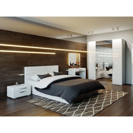 В коллекцию входят разнообразные модули – кровати 2-спальные с подъëмным механизмом и без, шкафы разной вместительности и конфигурации с возможностью выбора дверей глухих или зеркальных; комод, тумба, панель с зеркалом, а также набор глянцевых панелей для 3-ëх и 4-ëх створчатых шкафов для завершения композиции. Завершить композицию можно торцевым шкафом меньшей вместимости, что обеспечит свободный доступ возле дверей или проходов. Глубина меньшей вертикальной стенки 400 мм. Все шкафы могут комплектоваться как зеркальными дверями, так и глухими.